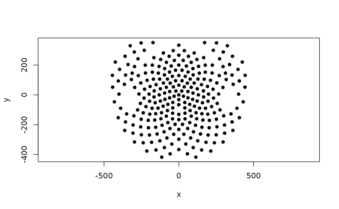 plot(HCGSN256$D2[,1:2], pch = 16, asp = 1)