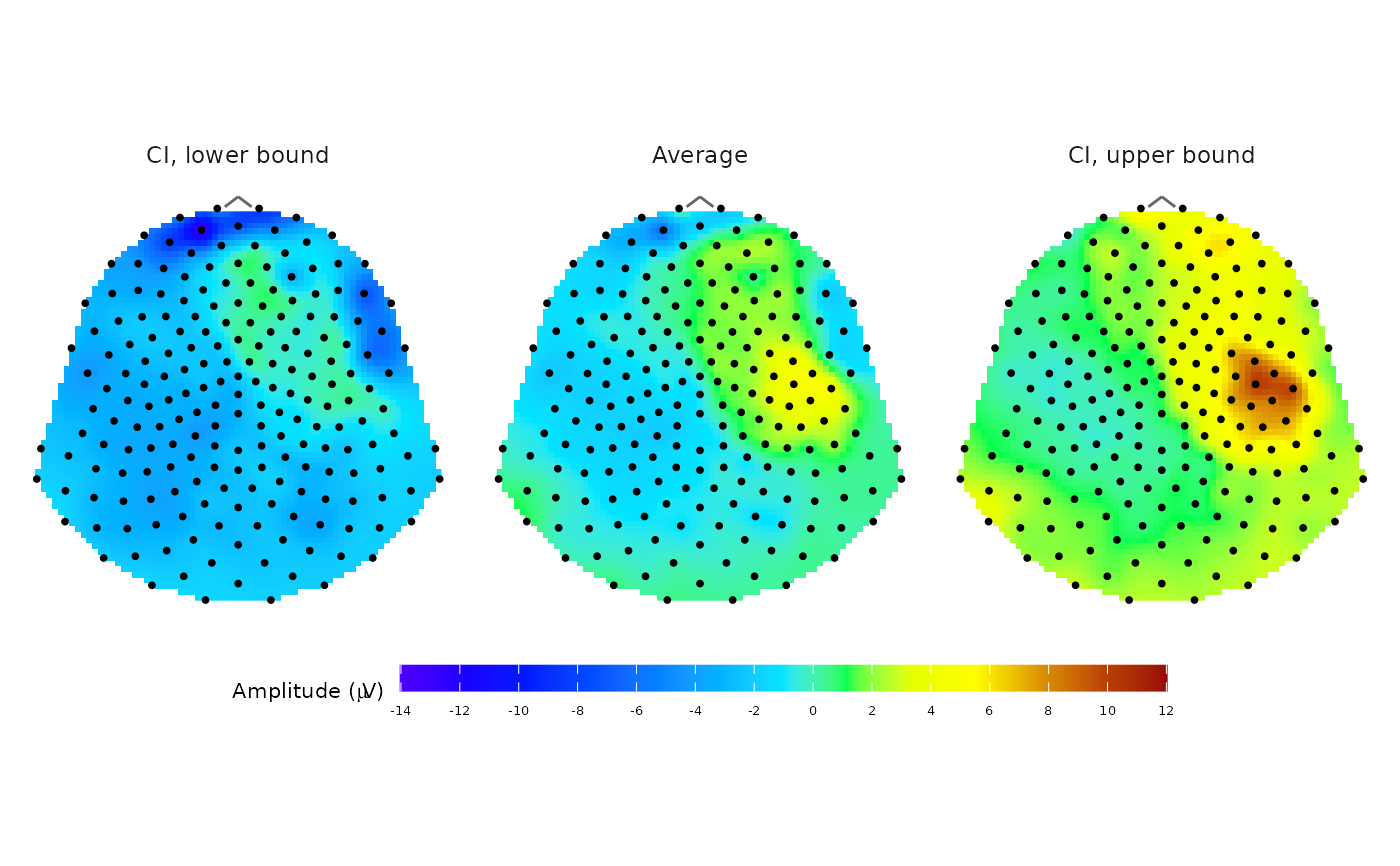 A ggplot object showing the static topographic map of the signal divided into three panels: CI lower, mean, CI upper.